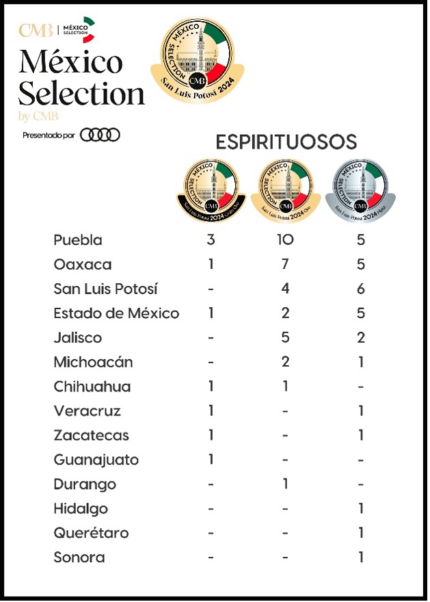 Ciudad de México. Noviembre 29, 2024.- Los resultados del México Selection by CMB, presentado por Audi, San Luis Potosí 2024, están disponibles. El jurado internacional otorgó medallas de Plata, Oro y Gran Oro a vinos y espirituosos de 17 estados productores de México. Los estados que han ganado más medallas en la categoría de vinos este año son Baja California, con 70 preseas; Coahuila, con 37, y Guanajuato, con 33. Los espirituosos premiados provienen principalmente de los estados de Puebla, Oaxaca y San Luis Potosí.